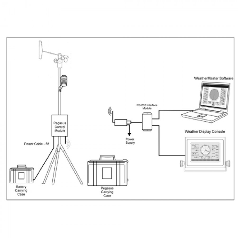 The Pegasus transmits weather data wirelessly via a pair of 2.4GHz transceivers to a monitoring option, such as a Weather Display Console or a computer running WeatherMaster software. An optional RS-232 Interface Module is available to connect the wireless transceiver to multiple devices. The transceivers communicate wirelessly, at a distance of 1 mile with a