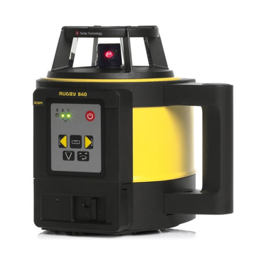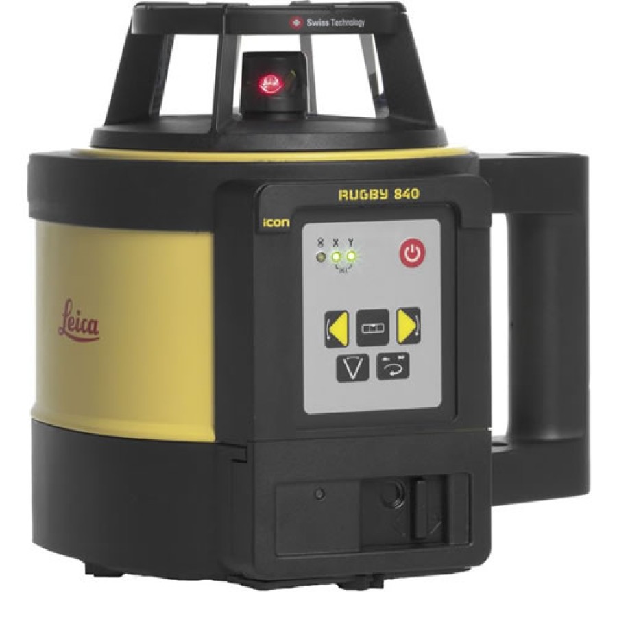 The Leica Rugby 840 The Rugby 840 Rotary Laser has dual-axis manual slope as well as horizontal, vertical, and 90° self-leveling. It automatically levels within 6°, has an accuracy rate of 1/16" at 100', and a working range of up to 2,300' when used with the included detector. Its has functions that allow construction professionals to complete projects quickly and easily by detecting and correcting movements, reducing errors and enhancing precision.