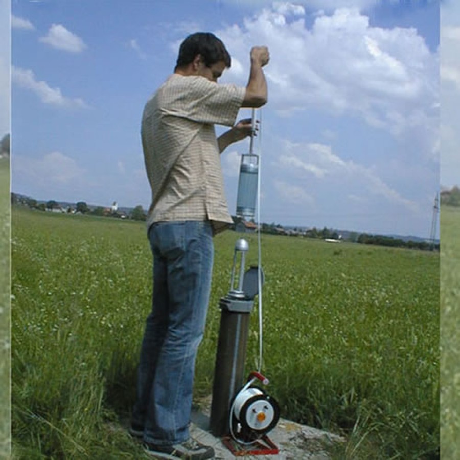 With the KLL-S, it is possible to take fluid samples down to a single centimeter of the desired depth. For this purpose, a casing tube is suspended above the piston. Upon reaching the depth of sampling, a shutter mechanism is triggered by a falling weight that pushes the casing above the pistons. The fluid sample can then be easily recovered with the hand crank on the KLL-S and removed with a drain cock.