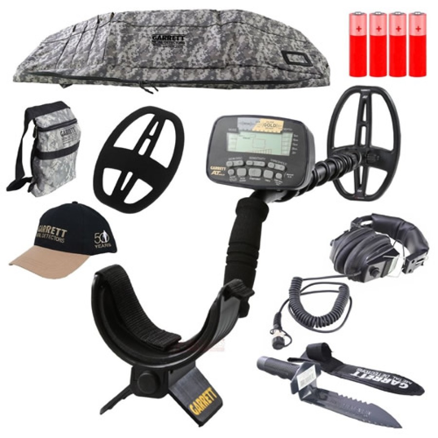 AT Gold Metal Detector with premium volume-control land headphones. Includes: 5"x8" (14x20cm) PROformance DD submersible searchcoil (as shown) Garrett MasterSoundTM headphones (waterproof headphones sold separately) Deep-seeking True All Metal Mode Performance for All Terrain Prospecting! WATERPROOF TO 10 FEET. Highly Recommended - Prospecting, Coin, Jewelry, Cache Hunting, Relic Hunting, Organized Hunts and Shallow Fresh Water Hunting. Not recommended for saltwater use or surf hunting. AT Gold includes 18kHz frequency for enhanced detection of small gold nuggets, jewelry, coins and relics!